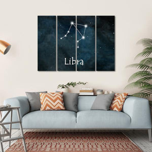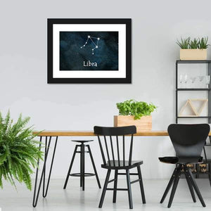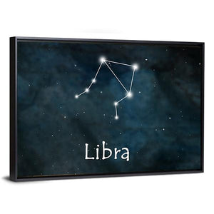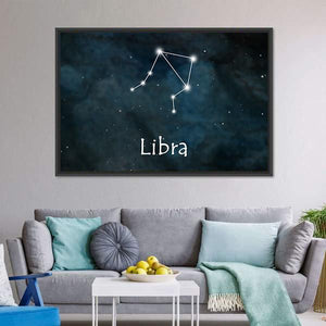 This canvas art features the Libra constellation in a serene dark blue palette, evoking a mysterious, cosmic atmosphere. The word 'Libra' is elegantly printed below the constellation, making it a thoughtful addition to your astrology-themed décor.