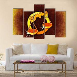This Libra canvas centers on the zodiac balance scale and the word "Waage," rendered in abstract, ornate forms in a gold, orange and brown palette. Its symmetrical composition and symbolic, astrological mood fits modern interiors and astrology-themed spaces.