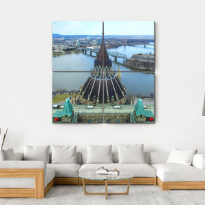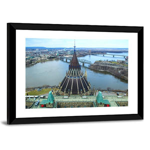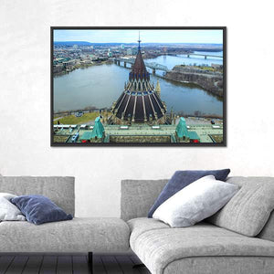 This canvas wall art captures the majestic Library of Parliament in Ottawa, showcasing its ornate tower and green statues against a backdrop of the river and city skyline. Its realistic portrayal and urban vibe make it a striking addition to any art collection.
