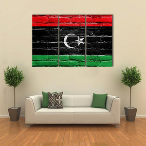 This canvas features the Libya flag over a textured brick wall, rendered in a realistic style with red, black and green tones. Its bold, patriotic mood fits modern homes and patriotic-themed rooms looking for graphic, statement wall decor.