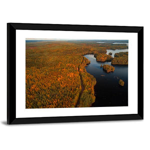A nature photograph showing an aerial view of dense evergreen forest, a dark lake and small islands in Liesjärvi National Park with hints of autumn foliage. Captured in a nature photography style, the orange, green, blue and brown palette creates a serene, autumnal and expansive mood that suits modern or nature-inspired rooms.