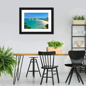 This canvas art features a serene island landscape with a white lighthouse standing on a grassy shore. The tranquil scene captures turquoise waters and a clear sky, making it a beautiful addition to coastal or nature-themed décor.