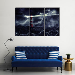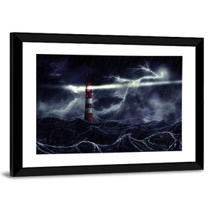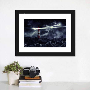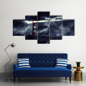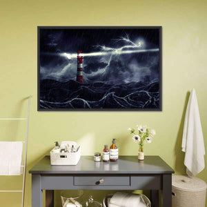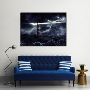 This dramatic canvas features a red and white striped lighthouse standing tall against a powerful stormy sea. With lightning illuminating the turbulent night sky, it captures the fierce beauty of nature in vivid dark blues, whites, and yellows.