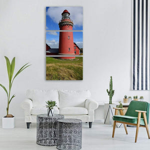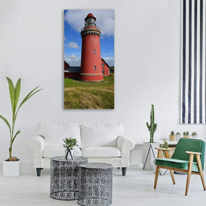 Red brick lighthouse and its attached red building rise above a field of dry grass beneath a blue sky with clouds. The photographic, low-angle composition and rule-of-thirds framing give a serene, picturesque coastal mood that fits coastal, nature-inspired, or modern room decor.