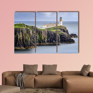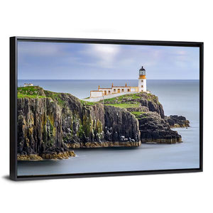 Neist Point’s lighthouse stands above rocky, greenery-lined cliffs beside a calm, long-exposure sea, giving the scene a serene, dramatic, majestic feel. The realistic landscape relies on blue, gray, green, and white tones to convey daytime coastal atmosphere. Suits coastal and modern interiors as a nature-focused wall accent.