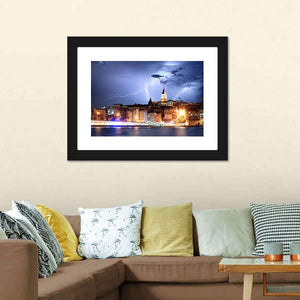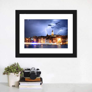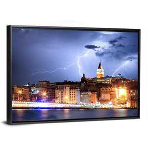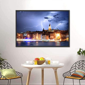 Capture the essence of Istanbul with this striking artwork showcasing a dramatic city skyline illuminated by glowing lights and intense forked lightning. The vibrant palette of blue, yellow, and orange against dark storm clouds creates an electric urban atmosphere.