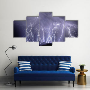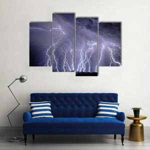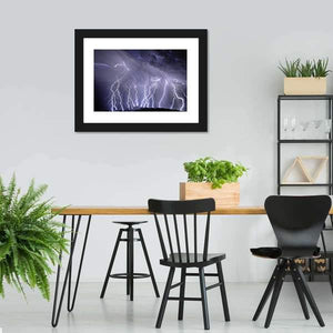 This striking canvas captures dramatic lightning strikes across the Rincon Mountains under stormy clouds. The intense palette of blues, purples, and blacks brings a powerful atmosphere to your space.