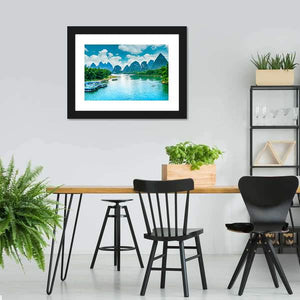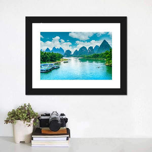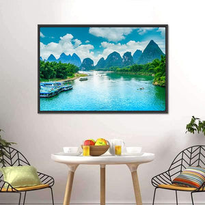 This canvas art features the tranquil beauty of the Lijiang River in Guilin, showcasing lush karst mountains, gentle clouds, and multiple boats docked on the left. It brings a serene and scenic atmosphere, perfect for any nature lover or modern décor.
