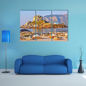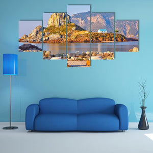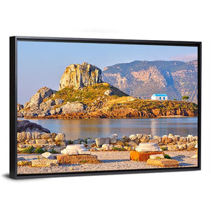 This canvas artwork features a serene coastal scene with a Greek church and ancient ruins set against a backdrop of blue sea and mountains. Its sunny atmosphere invites a sense of calm, making it a beautiful addition to any landscape art collection.