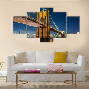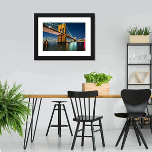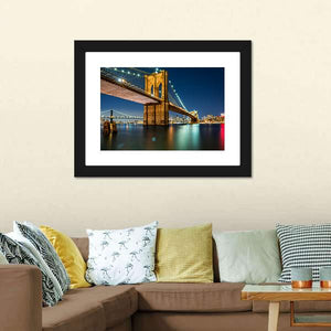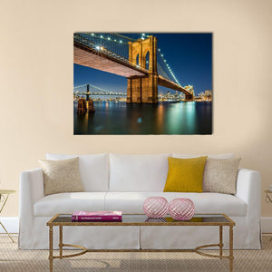This canvas features the iconic Brooklyn Bridge against the vibrant New York City skyline at night. The photorealistic depiction captures the glowing string lights and reflections in the water, creating a majestic urban atmosphere.