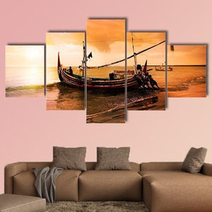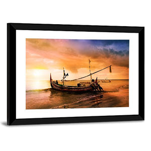 Local Boat On Beach captures a traditional fishing boat on calm water at sunset, using warm oranges and yellows with cool blues and browns. The realistic image follows a rule-of-thirds composition and highlights the boat’s reflection for a serene, peaceful feeling. It fits house and room decor, especially modern spaces that favor quiet beach scenes.