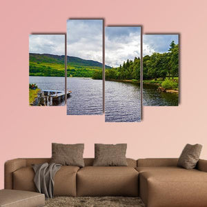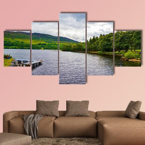 Loch Ness From Fort Augustus shows a calm, photorealistic lakeside scene with a wooden dock at left, tree-lined shores and distant mountains beneath an overcast sky. Rendered in blue, green and grey tones, it offers a serene, natural mood that suits modern or nature-inspired rooms.