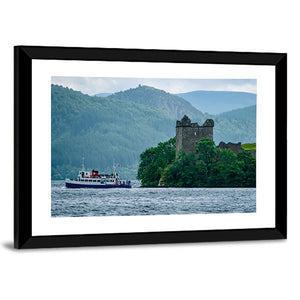 Lochness Urquhart Castle Canvas Art depicts the ruined Urquhart Castle on a small island, a tourist boat on the water, and misty mountains in the background. Rendered in blues, greens, grays and whites with a realistic, scenic style, it creates a serene, picturesque, historic mood that works well as room decor and in modern canvas art displays.