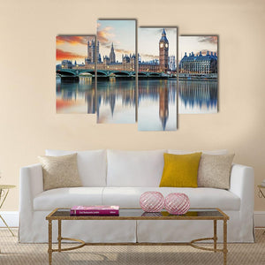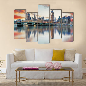 This canvas depicts Big Ben, the Parliament building and the River Thames at sunset, rendered in a realistic cityscape with orange, blue, grey and brown tones. The rule-of-thirds composition and the clock tower’s reflection in the water create a majestic, serene and dramatic mood, suited to modern living spaces and urban interiors.