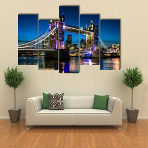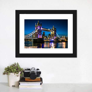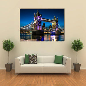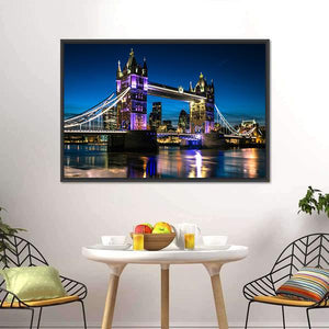 Tower Bridge at night is shown as a photorealistic London cityscape, rendered in blues, purples, white and yellow. Lights reflecting on the Thames create a calm nighttime mood that fits modern living rooms and offices seeking city-inspired wall decor.