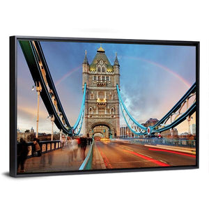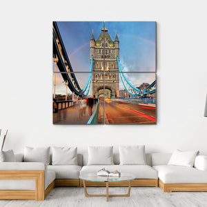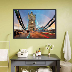 This stunning canvas captures the dynamic beauty of Tower Bridge in London, showcasing light trails from traffic against a dramatic sky. The blend of blue, orange, and grey creates a majestic atmosphere, perfect for any cityscape lover.