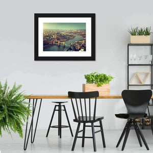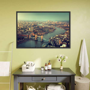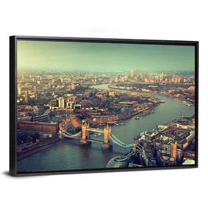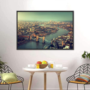 This aerial panoramic canvas centers on Tower Bridge, the river and surrounding city in a vintage, urban cityscape. Muted blues, greens, browns and grays give the scene a scenic, calm mood that works well with modern and vintage room decor.