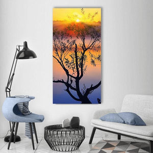 Tree silhouette at sunrise, with bare branches and glowing sun rays over calm, mist-softened water. The warm yellow, orange and blue palette creates a serene, tranquil mood that suits modern or nature-inspired rooms.