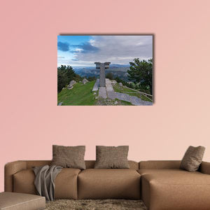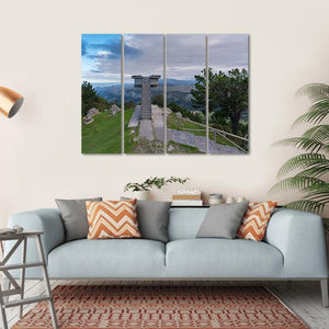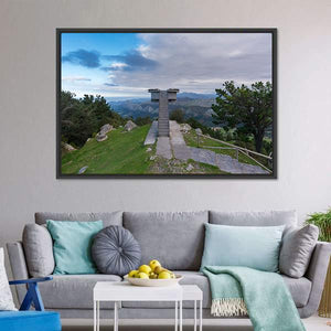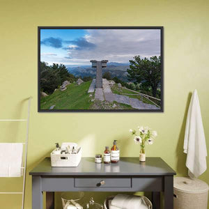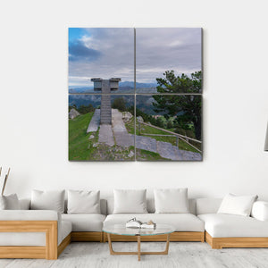This canvas features a serene observation tower set against a sweeping mountain range and lush trees under a partly cloudy sky. Its photorealistic style captures the expansive beauty of nature, making it a lovely addition to any space.