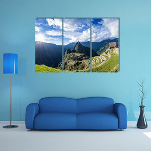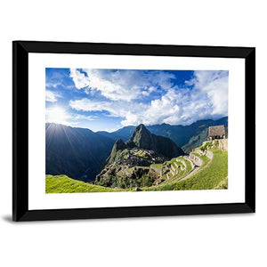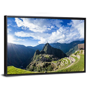 City Of Machu Pichu Canvas Wall Art shows ancient ruins nestled in terraced mountains and a broad valley, with sun rays breaking through the clouds. The wide aerial composition and blue-green palette create a majestic, serene, historic mood that suits modern living rooms or studies seeking nature-inspired wall decor.