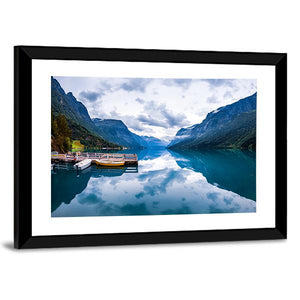 Capture the serenity of Norway with this realistic canvas print of Lovatnet Lake. Featuring two small boats docked amidst a vast mountain landscape and reflecting clouds above, this artwork evokes a peaceful atmosphere, perfect for any nature lover.