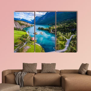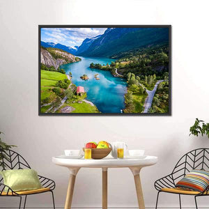 Lake Lovatnet in Norway presents a serene mountain lake with a red-roofed house by the water and snow-capped peaks in the distance. An aerial perspective and rule-of-thirds composition create depth, and the blue, green, gray and white palette gives a peaceful, majestic mood—suitable as room decor for living rooms or offices.