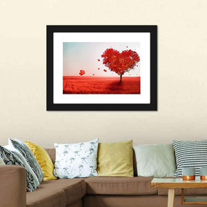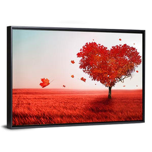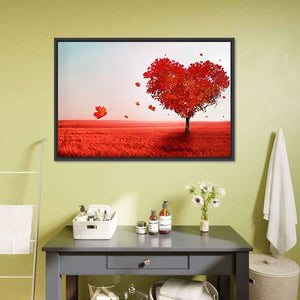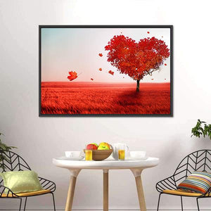 This enchanting artwork features a heart-shaped tree surrounded by falling leaves over a vibrant red field. Its romantic and peaceful autumnal mood makes it a perfect addition to any nature-themed space.
