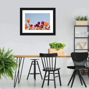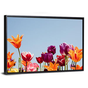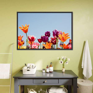 Bright and cheerful, this canvas wall art features a close-up view of vibrant tulips set against a clear blue sky. It adds a lively touch to any space, perfect for welcoming spring into your home.