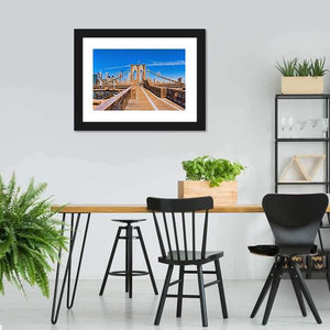 Experience the iconic Brooklyn Bridge and New York City skyline in this photorealistic canvas art. With a vibrant palette of blue and brown against a clear sky, this piece brings a bright, urban ambiance to your space.