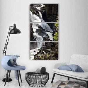 Lower Ogwen Waterfall Canvas shows a photorealistic view of rushing water, rocky outcrops, and trees. The white, grey, green, and brown palette and visible motion create a powerful, serene natural mood. It works well in modern or nature-inspired rooms as wall decor.