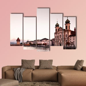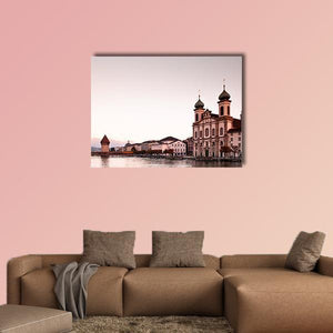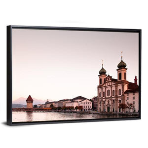 A realistic cityscape of the Jesuit Church in Lucerne, showing the river, a wooden covered bridge, ornate twin domes and a tall clock tower. The muted beige, brown and gray palette and rule-of-thirds composition give the scene a calm, peaceful, early-morning mood. Suits modern or traditional room decor that welcomes serene, architectural artwork.
