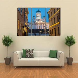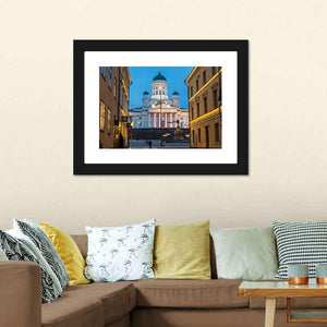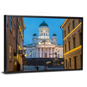 This photorealistic artwork captures the serene beauty of the Helsinki Cathedral at dusk. Featuring a symmetric street view, it highlights the iconic dome and columns, creating a calm and historic atmosphere perfect for any space.