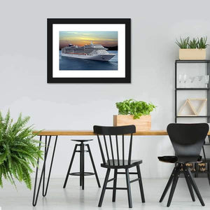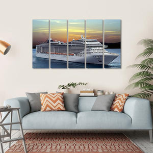 This vibrant canvas features a large cruise ship gracefully sailing over serene waters at sunset. The warm palette of oranges, blues, and whites creates a tranquil and adventurous atmosphere, making it a striking addition to any room.