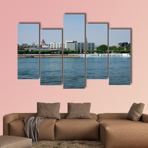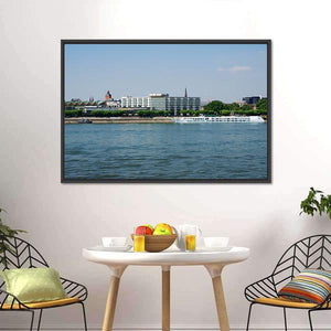 This canvas depicts a riverside cityscape with modern buildings and a long white boat beneath a clear blue summer sky. The realistic, calm and bright scene works well in modern interiors and contemporary room decor.
