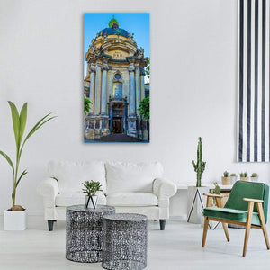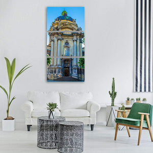 A focused depiction of a Lviv church cathedral in Ukraine, showing a centered, symmetrical facade with dome, columns, an inscription above the entrance and a cross on the dome. The blue, beige, green and white palette creates a grand, serene, classical mood. Suited to classical or architectural interiors as understated room decor.