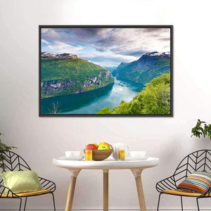 This canvas art captures the stunning fjords of Norway, showcasing majestic mountains that rise dramatically against a serene sky filled with clouds. With lush greenery and snow-capped peaks, it brings a sense of nature's beauty to your space.