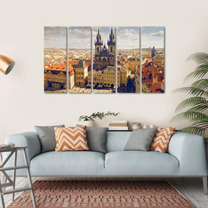This canvas art features a detailed aerial view of Old Town Square in Prague, showcasing the stunning Church of Our Lady before Týn. With its warm palette of oranges, yellows, and browns, it captures the historic charm and bustling atmosphere of this picturesque city.