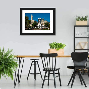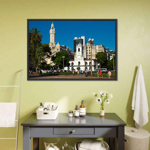 Main Square Plaza De Mayo shows a lively, sunny city plaza with historic arched facades, a tall clock tower, palm trees, street lamps, and people walking. Rendered realistically in white, beige, green, and blue tones, it brings a vibrant, historical mood that works well in modern rooms and home decor.