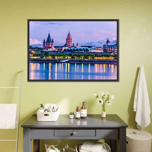 Capture the serene beauty of Mainz with this canvas depicting its iconic skyline. Featuring distinctive church spires and shimmering lights reflecting on the river, this artwork brings a peaceful twilight atmosphere to any space.