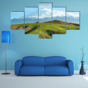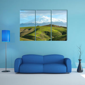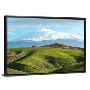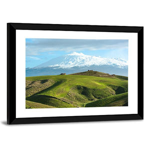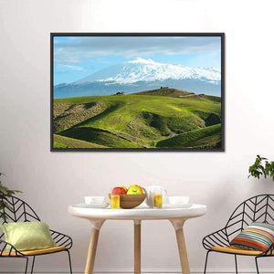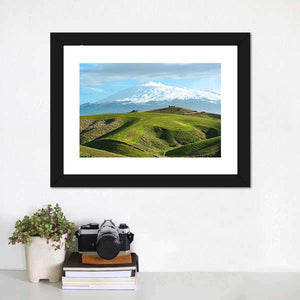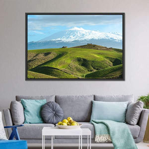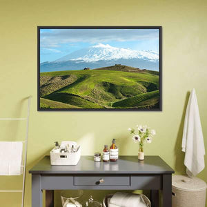This canvas art features a serene, snow-capped mountain surrounded by rolling green hills and a charming farmhouse. With its majestic atmosphere and stunning photorealistic quality, it invites tranquility into any space.
