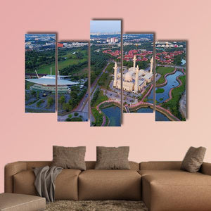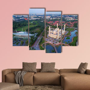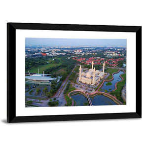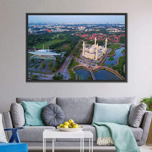 Aerial, wide-view canvas of a mosque by the water, featuring multiple minarets, a bridge, and an expansive cityscape with surrounding greenery. The realistic tan, green, blue, white, and gray palette gives the scene a serene, peaceful, and grand mood. A calm focal piece for home wall decor.