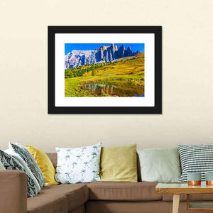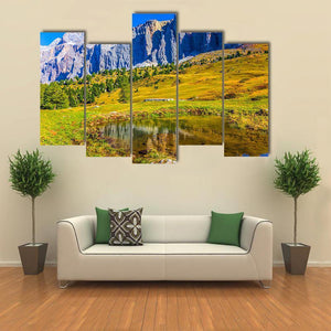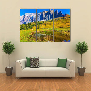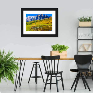 Majestic Rocks In Italy presents a realistic mountain range with rocky peaks, a reflective pond and grassy hills. The scene feels serene and natural, rendered in green, blue, yellow and brown tones. It suits modern or nature-themed rooms as calm wall decor.