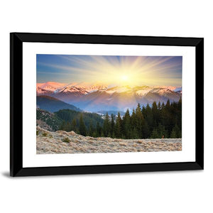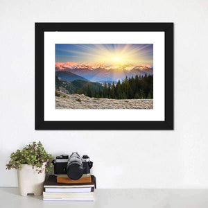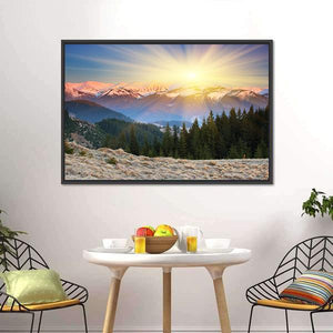 A serene, majestic mountain and forest scene at sunset, rendered realistically with a sunburst, snow-capped peaks and pine trees. Soft blues, greens, yellows and pinks create a calm, inspiring atmosphere that suits modern living rooms or bedrooms.