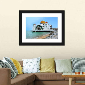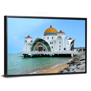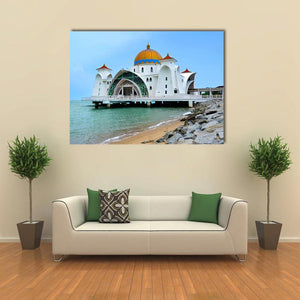 Malacca Straits Mosque in Malaysia is shown in a realistic canvas print, with the mosque, calm water and shoreline, a golden dome and arched entryway featured in symmetrical composition. Cool blues and whites with touches of gold and brown create a peaceful, scenic mood that fits modern interiors and home wall decor.