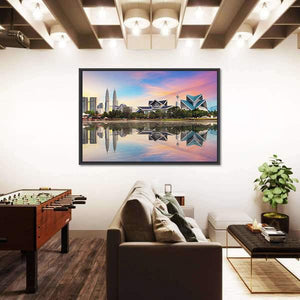 This canvas art features a symmetrical cityscape of Malaysia, highlighting the iconic Petronas Twin Towers against a serene skyline. Painted in vibrant colors like blue, pink, and orange, it brings a tranquil yet lively atmosphere to any space.