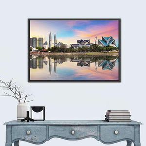 This canvas features the striking skyline of Malaysia, showcasing iconic skyscrapers like the Petronas Towers against a vibrant sunset sky. The serene water reflections and modern architecture create a breathtaking atmosphere, perfect for any art lover.