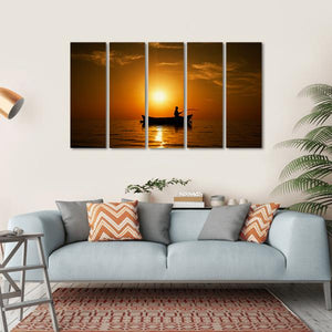 This canvas features a serene sunset scene with a silhouette of a person fishing from a boat. The warm palette of orange, yellow, and brown evokes a peaceful atmosphere, making it a beautiful addition to any nature-themed decor.