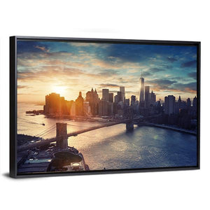 This photorealistic canvas captures the New York City skyline and Brooklyn Bridge in an aerial wide shot with dramatic sunset lighting. Blue, orange, gray and white tones create a serene, epic mood that suits modern living spaces and offices.