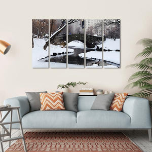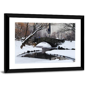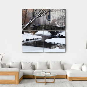 This serene depiction of Gapstow Bridge in New York evokes a quiet winter atmosphere. The canvas features a snow-covered landscape with a stone bridge, trees, and ducks in the water, creating a calming view for any space.
