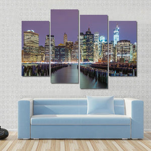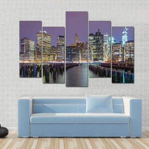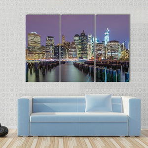 This striking canvas art captures the Lower Manhattan skyline at dusk, showcasing iconic skyscrapers by the waterfront. With a serene blend of purple, blue, and orange, it offers a modern, urban vibe perfect for any living space.